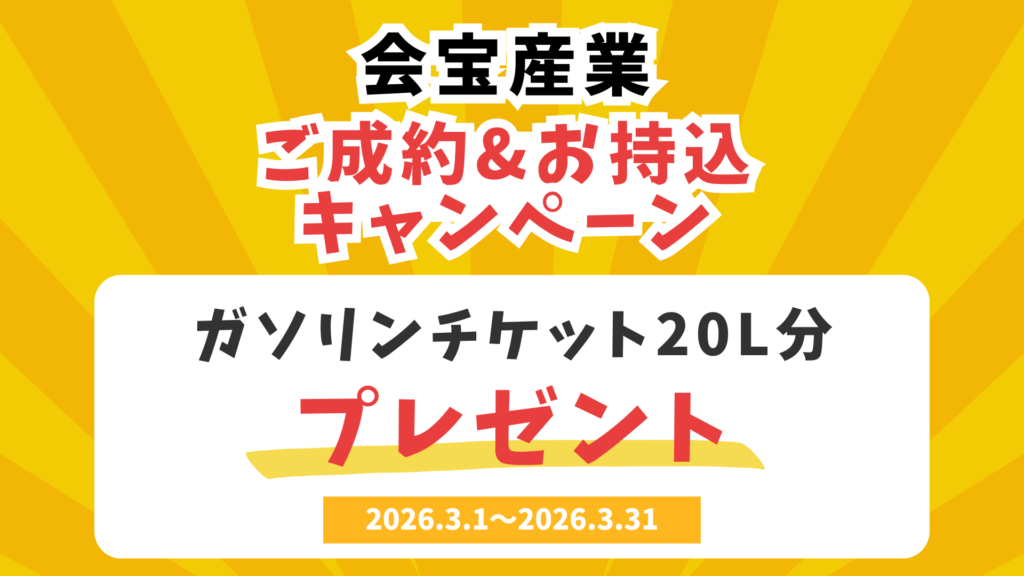 会宝産業では、3/31(火)までの期間中、お車をお持込&ご成約いただいたお客様にガソリンチケット20L分プレゼント中!